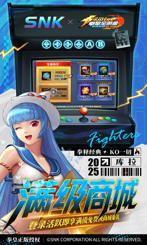 ★【开局豪礼】登录即领3星八神庵+绝版0.1折头像框+海量资源 ★【新服狂欢】在线即送月卡+300抽+5星八神庵,免费招募直送7星+超绝觉醒 ★【至尊VIP】0.1折拿下草薙京NEST和超绝觉醒,尊享原版VIP奖励! ★【天天648】次日起,每日领648元可拆分代金券 ★【万元代金】激活勋章,月活轻松拿10000元永久代金券,随心买买买 ★【钻石保值】每日送出大量钻石,可无限次抽取顶级品质格斗家及海量豪礼 ★【登录有礼】新服登录送4星暴走八神庵+武器觉醒+1000抽+限定“暴八萌头”,开局即巅峰 ★【新服